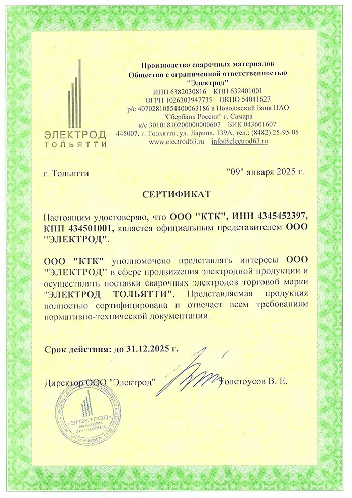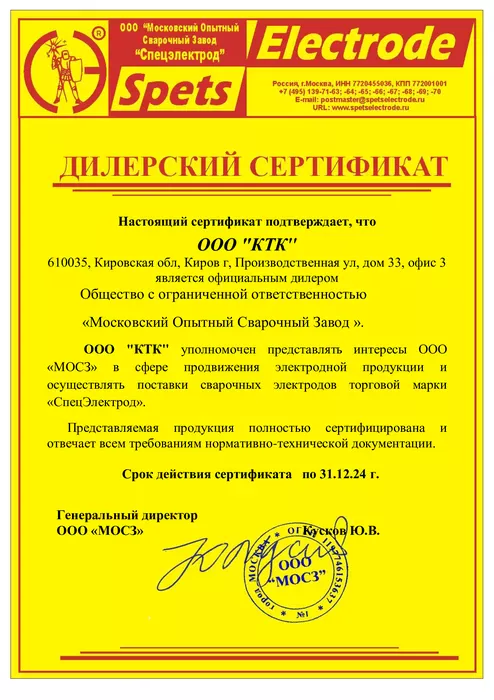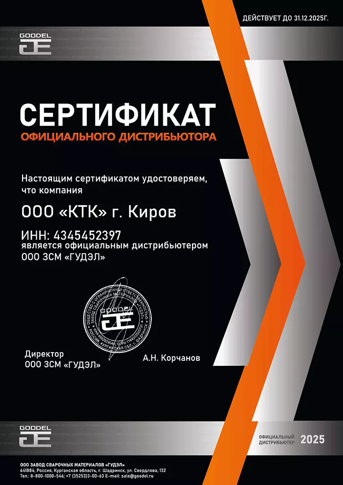 ООО "КТК" – Все для сварки состоит из высококвалифицированных специалистов, знающих свое дело, и включает в себя целый ряд оптово-розничных комплексов, складских помещений, позволяющих держать сотни тонн сварочных материалов в наличии, а свой отдел логистики позволяет в кратчайшие сроки доставить товар до покупателя.