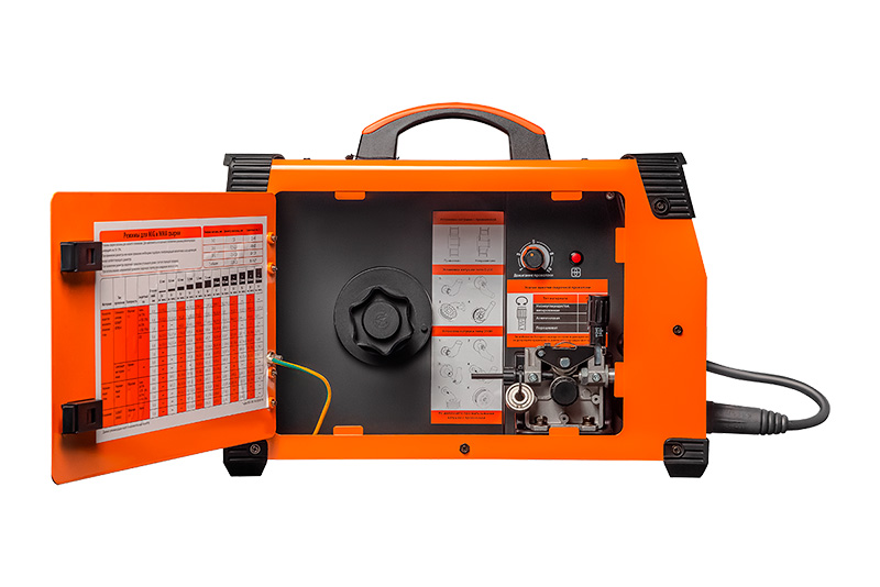 - мощный мотор и двухроликовый подающий механизм обеспечивает плавный и безрывковый процесс сварки;