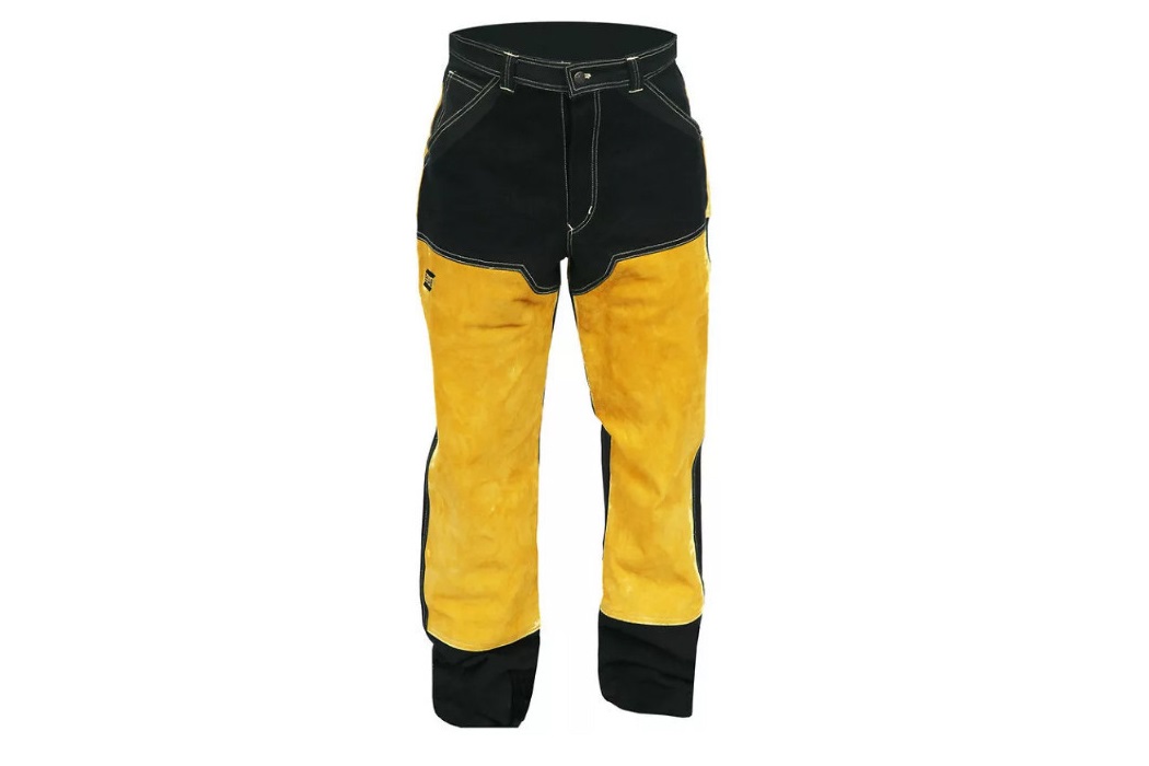 Защитные брюки созданы из современного синтетического материала Proban. Его характеризует устойчивость к термическому и механическому воздействиям. В передней части брюки усилены кожей специальной выделки во избежание попаданий сварочных брызгов и искр. Кроме того, кожа отлично защищает сварщика от термического воздействия.