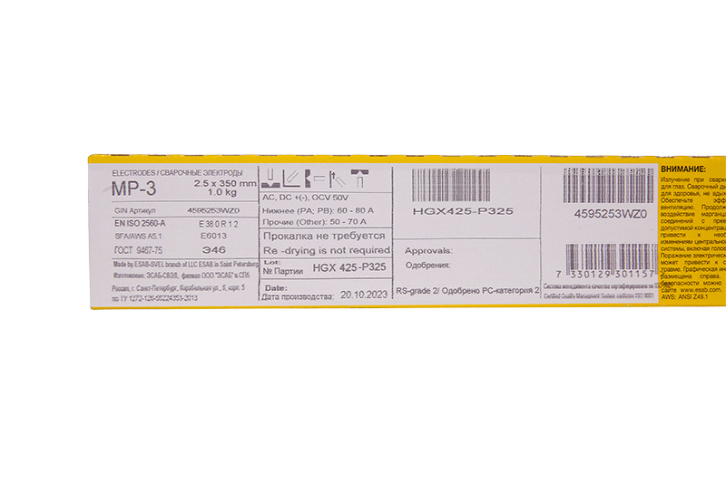 Классификации и одобрения сварочных электродов МР-3 диаметр 2.5 мм ESAB пачка 1 кг