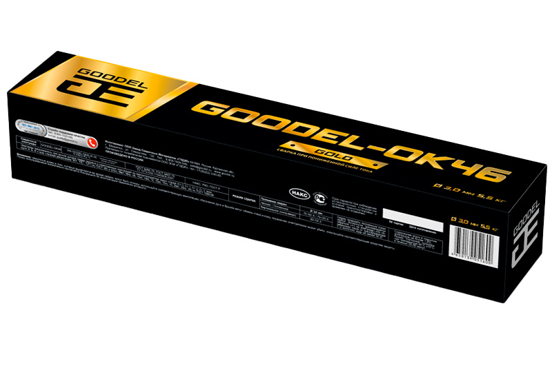 Сварочные электроды ОК-46 GOLD 3.0 мм 5,5 кг GOODEL используются для сварки рядовых и ответственных конструкций из углеродистых и низколегированных сталей с временным сопротивлением разрыву не менее 451 МПа. Кроме того, они применяются для прихваток, корневых швов, заварки широких зазоров и сварки тонколистового металла.