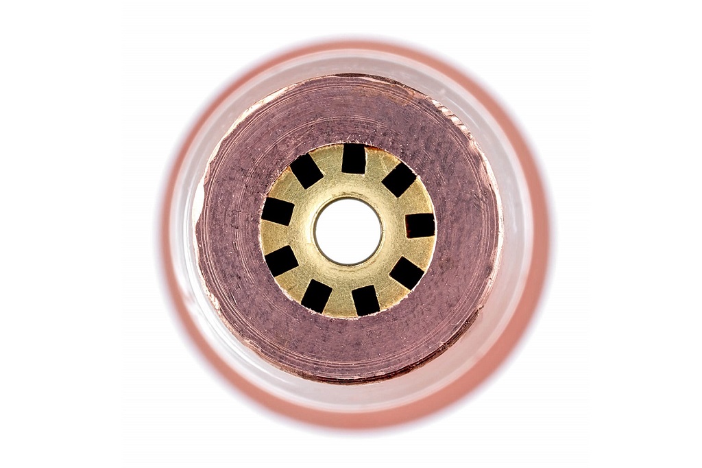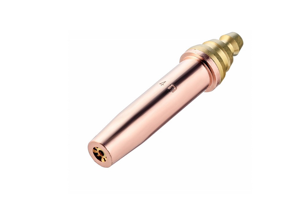 Разборный пропановый мундштук №4П (PNME 9) к 3-х трубным резакам внутрисоплового смешения газов Р3-300 и Р3-345. Толщина разрезаемого металла 50–100 мм. Мундштук с широкими шлицами. Газосмесительный мундштук имеет три запорных пояска, которые предотвращают перетечку газов и обеспечивают смешение газов непосредственно в мундштуке, обеспечивая безопасное использование.