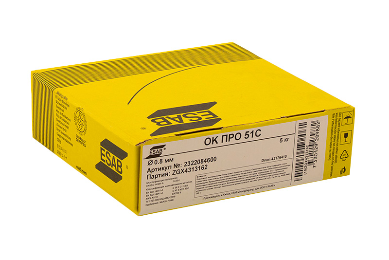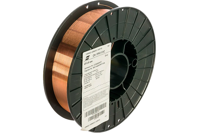 Сварочная омедненная проволока ESAB диаметром 0.8 мм ОК ПРО 51С 5 кг применяется для сварки низкоуглеродистых и низколегированных сталей с пределом текучести свыше 420 МПа в углекислом газе и газовой смеси.