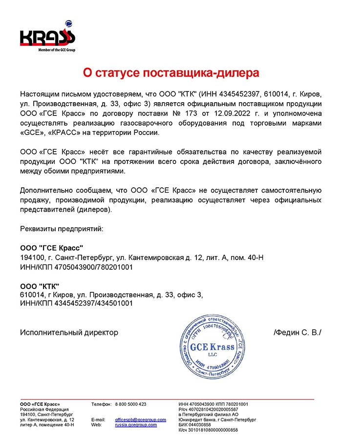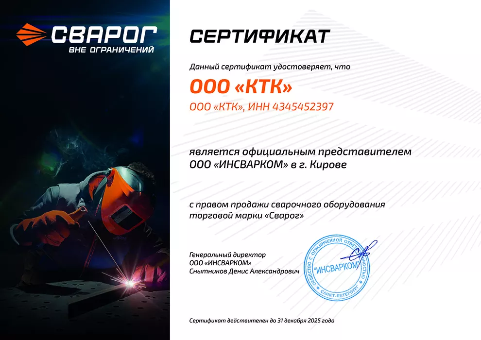 ООО "КТК" – Все для сварки состоит из высококвалифицированных специалистов, знающих свое дело, и включает в себя целый ряд оптово-розничных комплексов, складских помещений, позволяющих держать сотни тонн сварочных материалов в наличии, а свой отдел логистики позволяет в кратчайшие сроки доставить товар до покупателя.